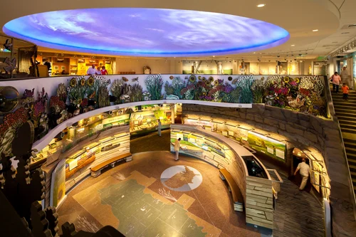 Dynamic graphics, artifact displays, and interactives draw visitors into the history.