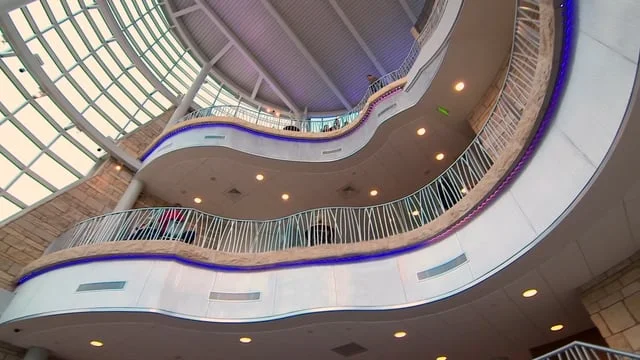 The central gallery of the museum holds, "This Little Light of Mine," an interactive sculpture animated by light and sound. The sculpture responds to the number and movement of visitors gathered within the space.